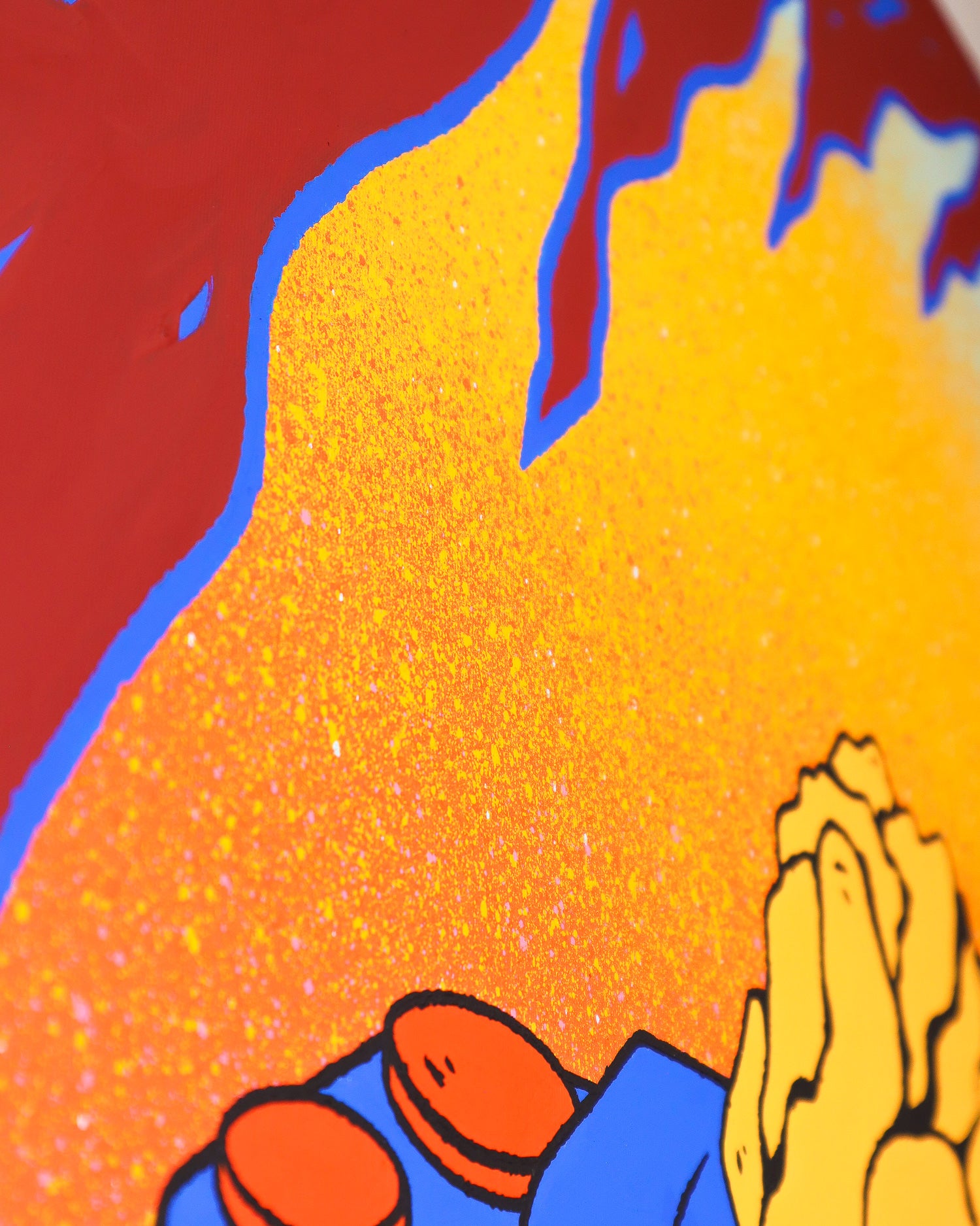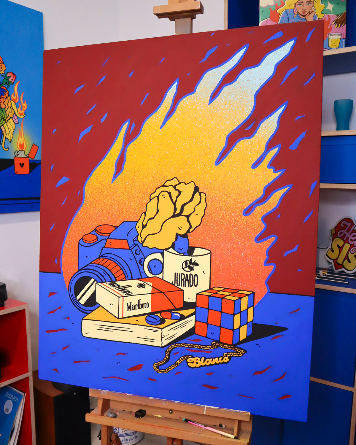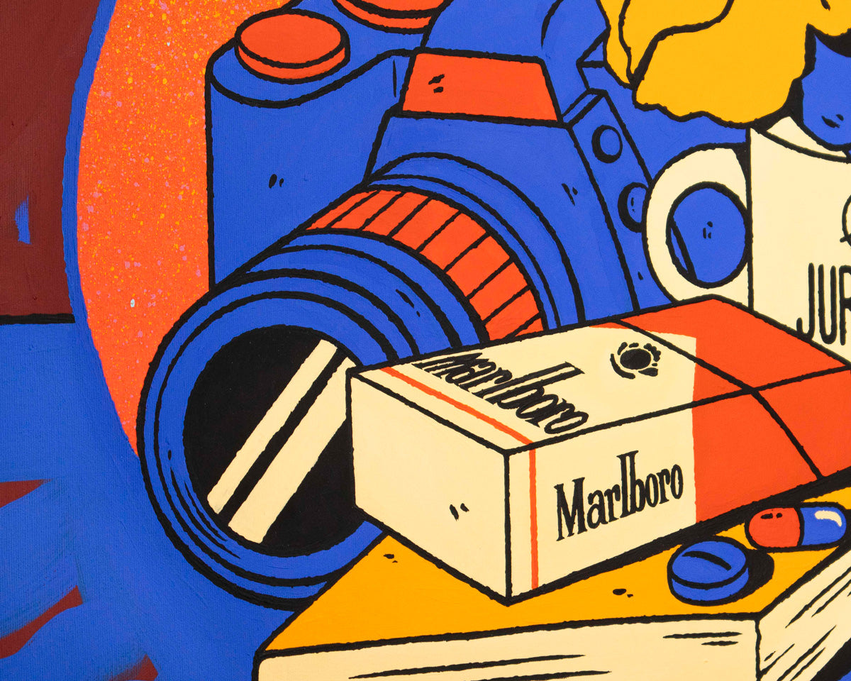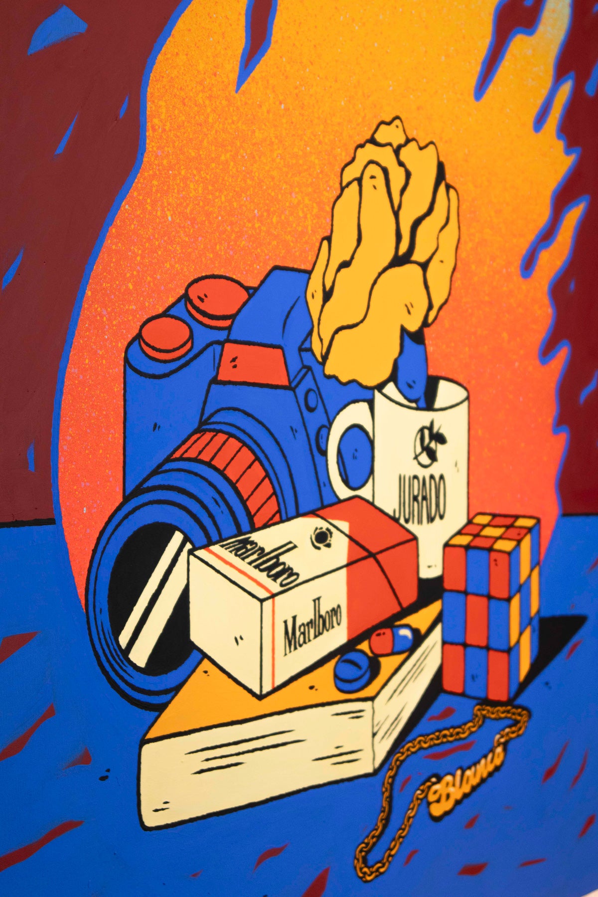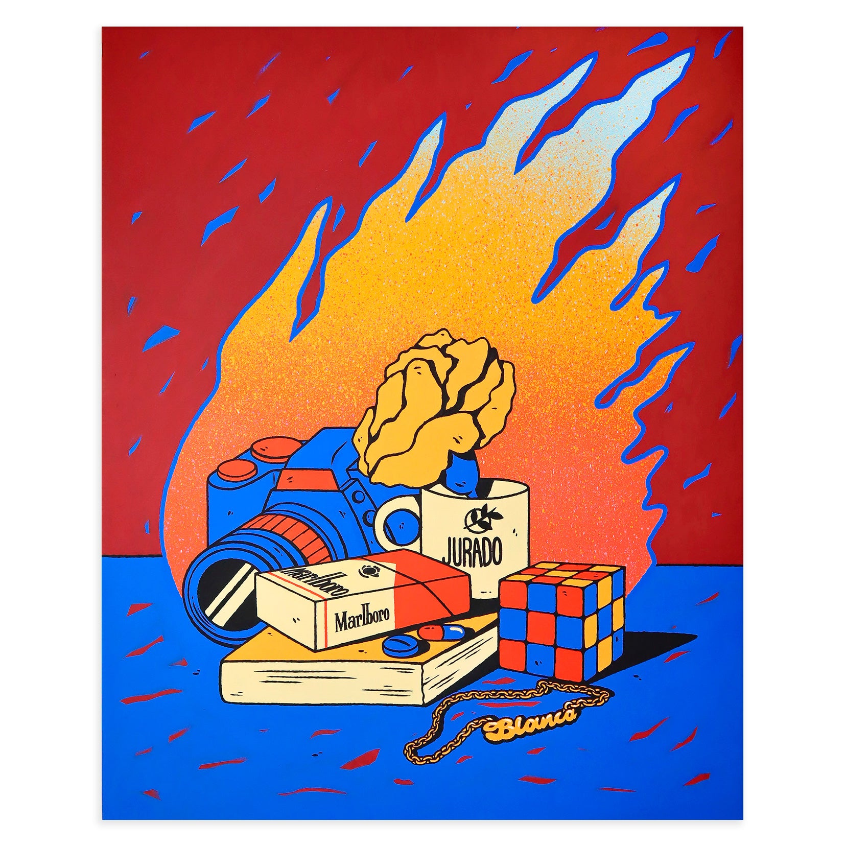 Be Fernández's still life paintings reveal the artist's most personal side, depicting memories, people, experiences, and emotions through the several elements which compose the works. In this scene, the light of the fire illuminates a still life in which each element burns, becoming part of the past. Everything in the scene seems to be a contradiction: seemingly inert objects, all consumed by the fire, yet simultaneously intensified by it, causing the pieces to merge and blend in a chromatic chaos. A reflection on change, the passage of time, and detachment.